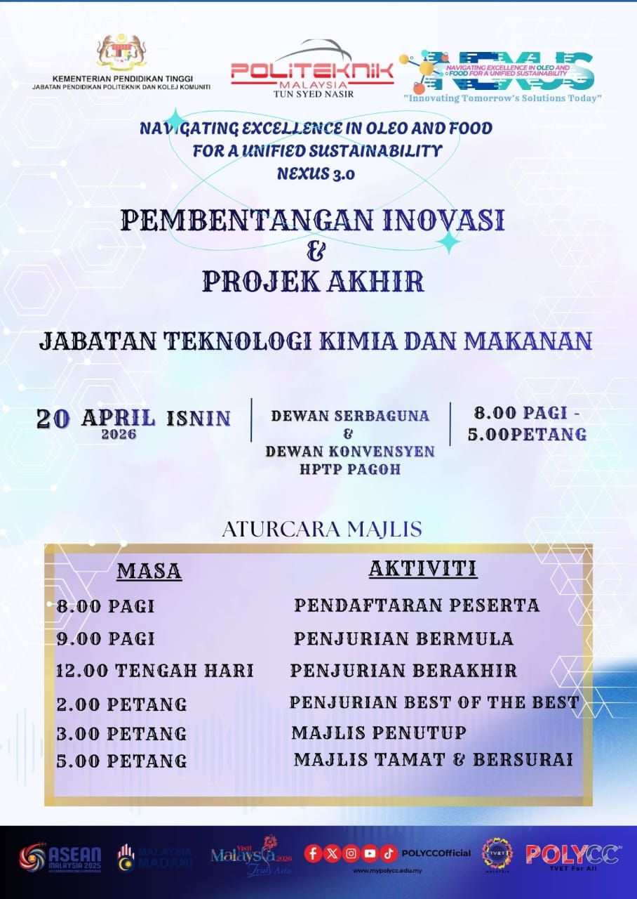 Semua warga PTSN khususnya JTKM dijemput hadir bagi memeriahkan NEXUS 3.0 serta menyaksikan pembentangan inovasi dan projek akhir pelajar DTM dan DFO yang mengetengahkan kreativiti, inovasi dan kecemerlangan ke arah masa depan yang lebih lestari.